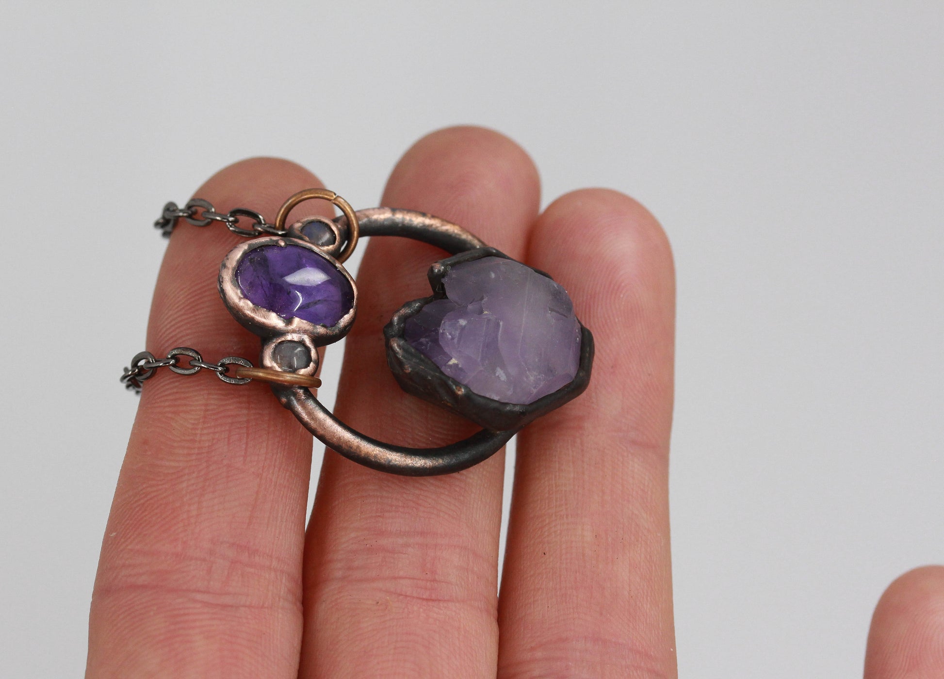 An amethyst cluster on an oxidized copper hoop with an amethyst and two moonstone above.