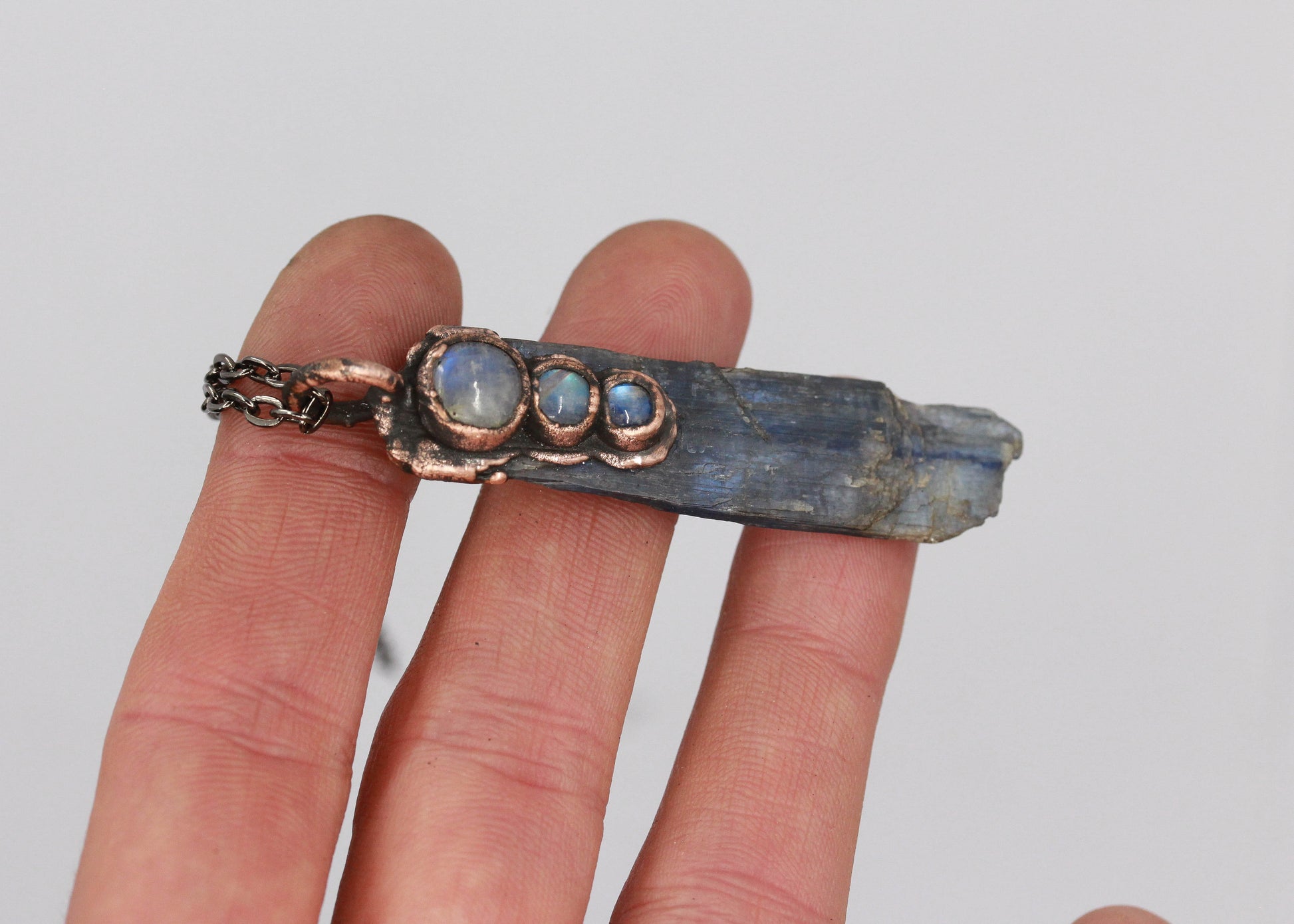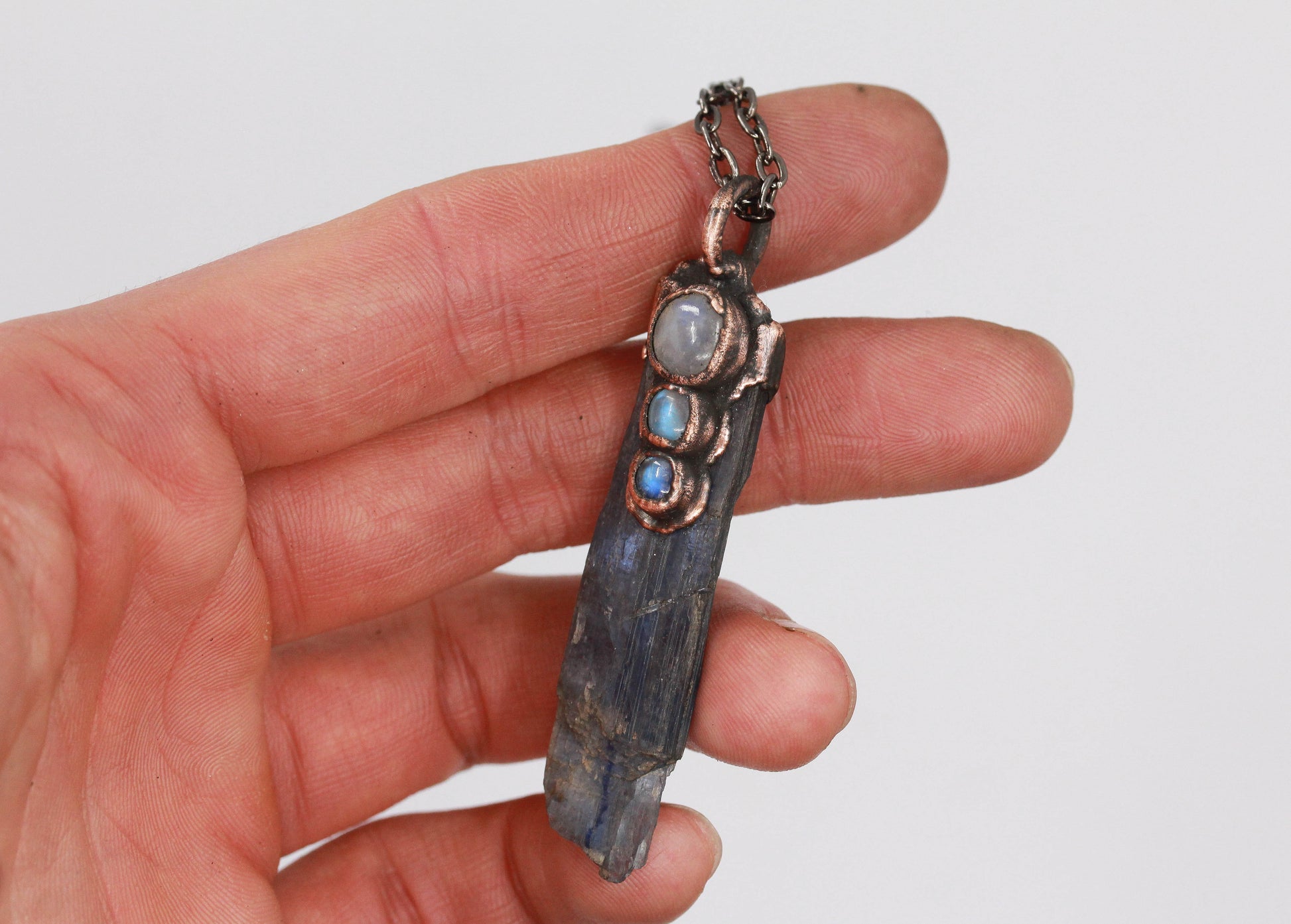 A raw blue kyanite with a three moonstone, set in a thick layer of electroformed copper.
