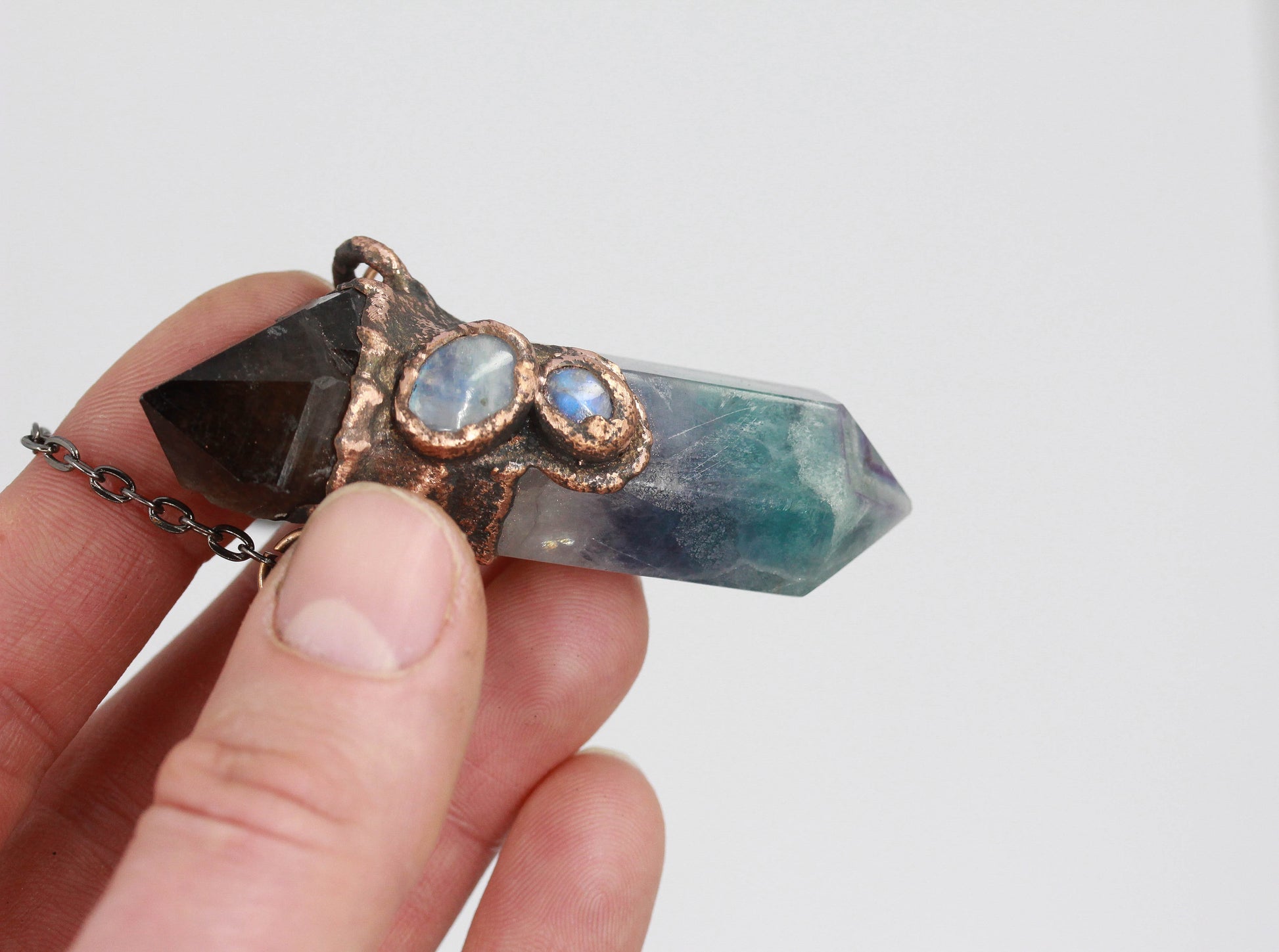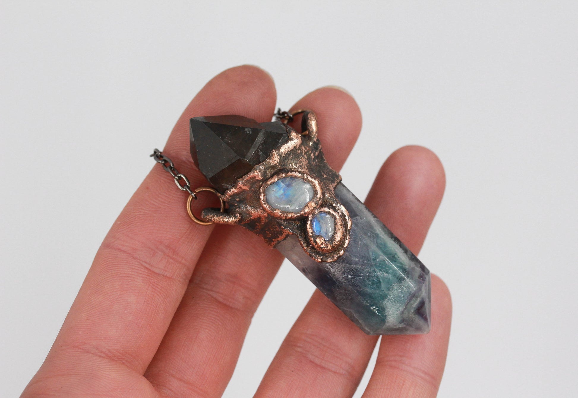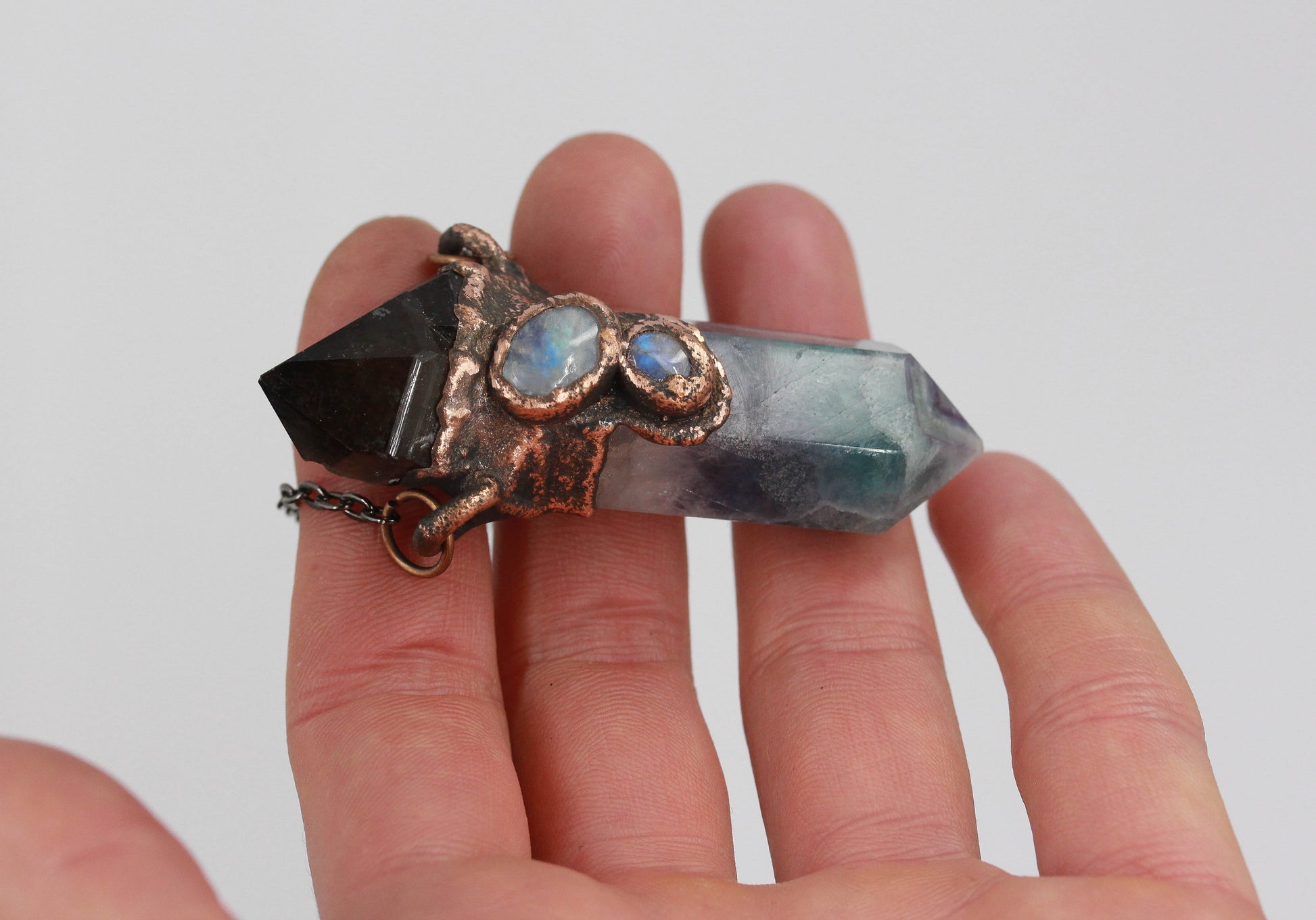 A polished fluorite point with a smoky quartz above and two moonstone at the center. Set in a thick layer of electroformed copper.