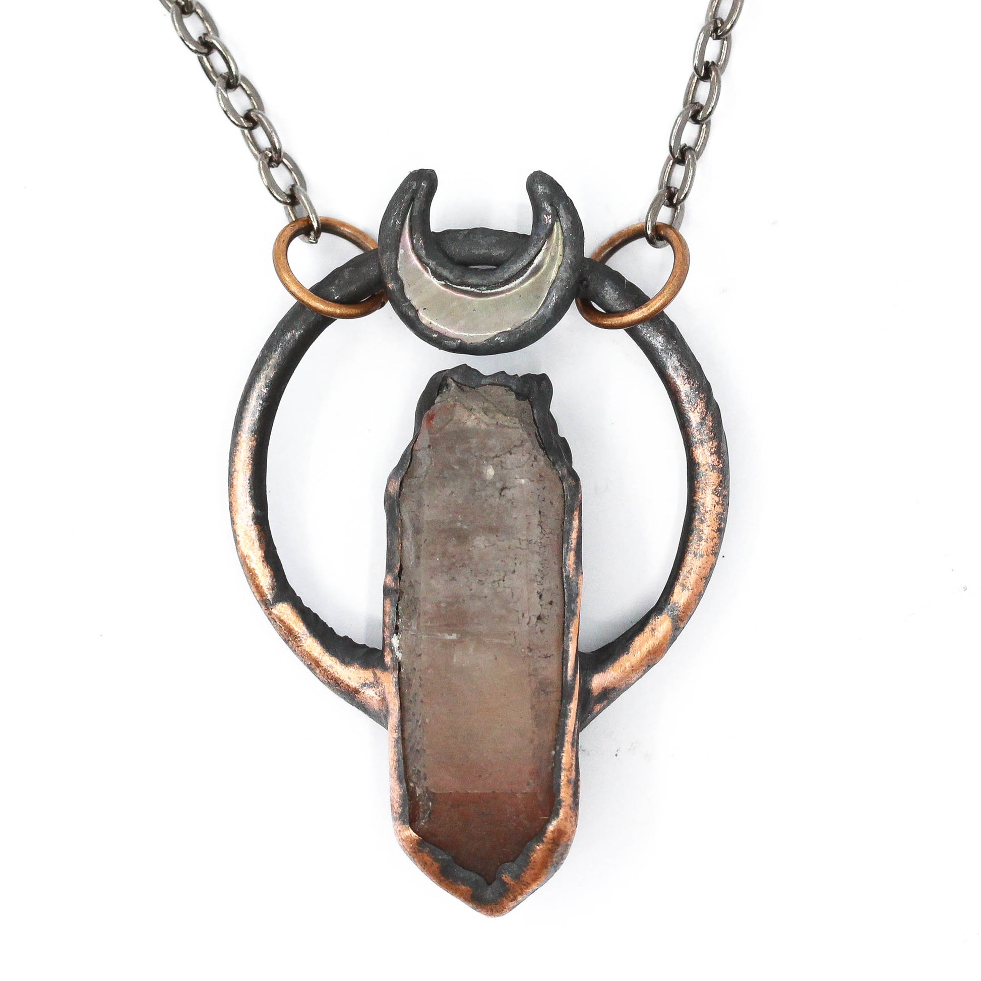 A red hematite quartz on an oxidized copper hoop with an abalone shell moon.