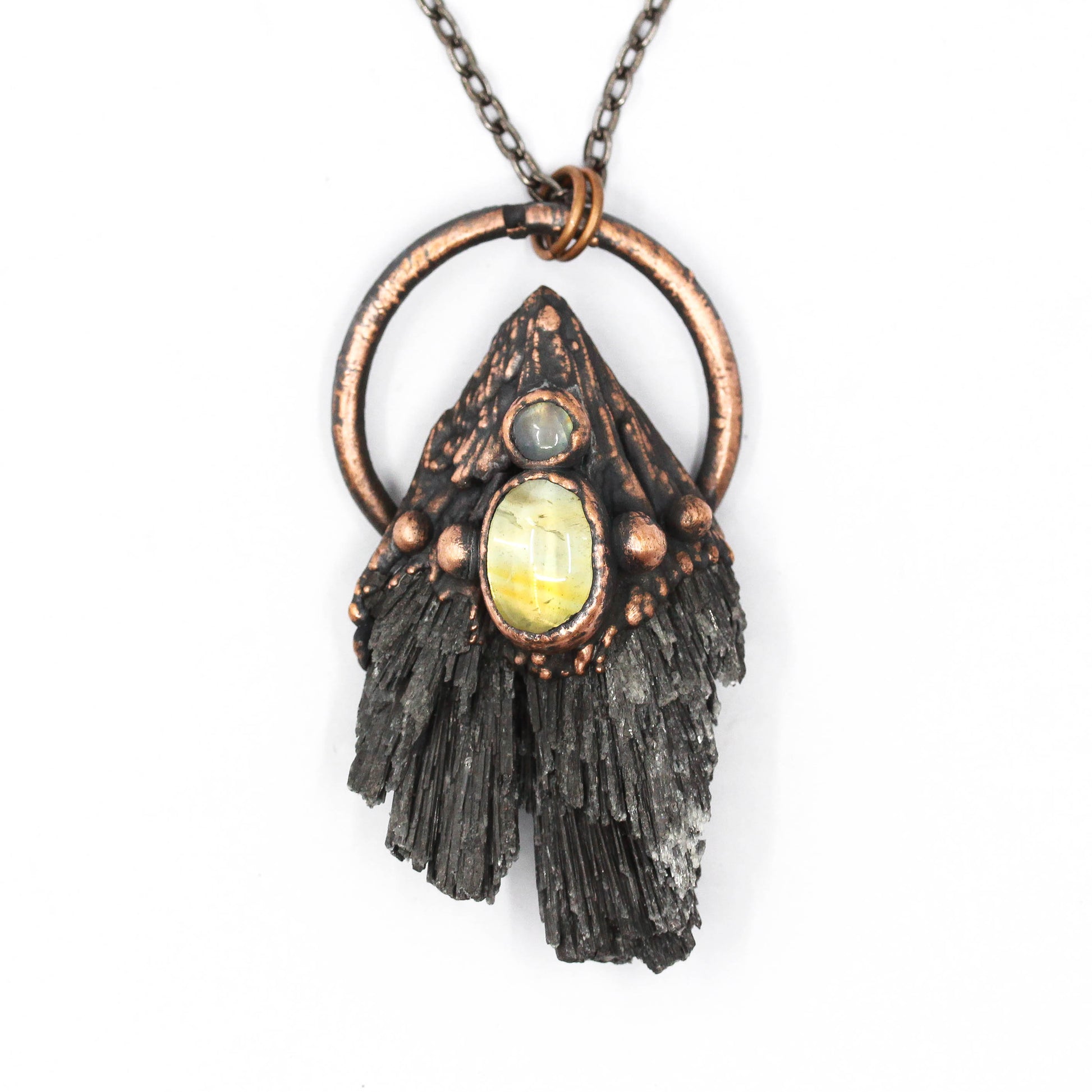 A black kyanite set in heavily textured copper with a citrine and moonstone at the center.