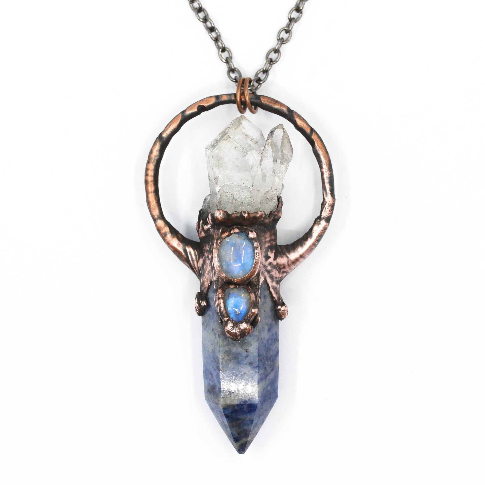 A polished lapis lazuli point with a quartz cluster above and two moonstone at the center. Set in electroformed copper.