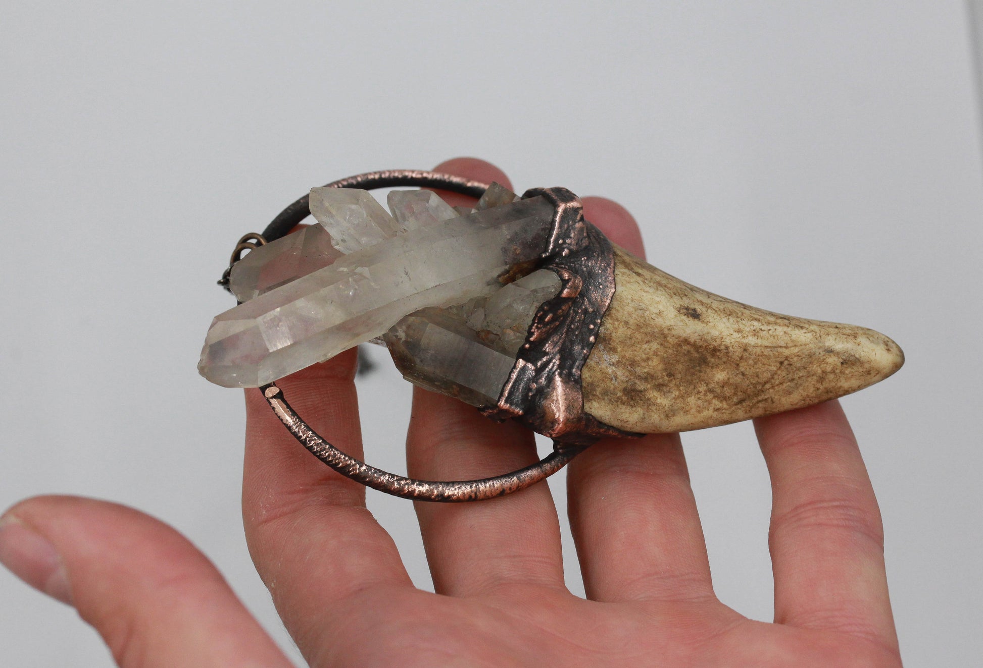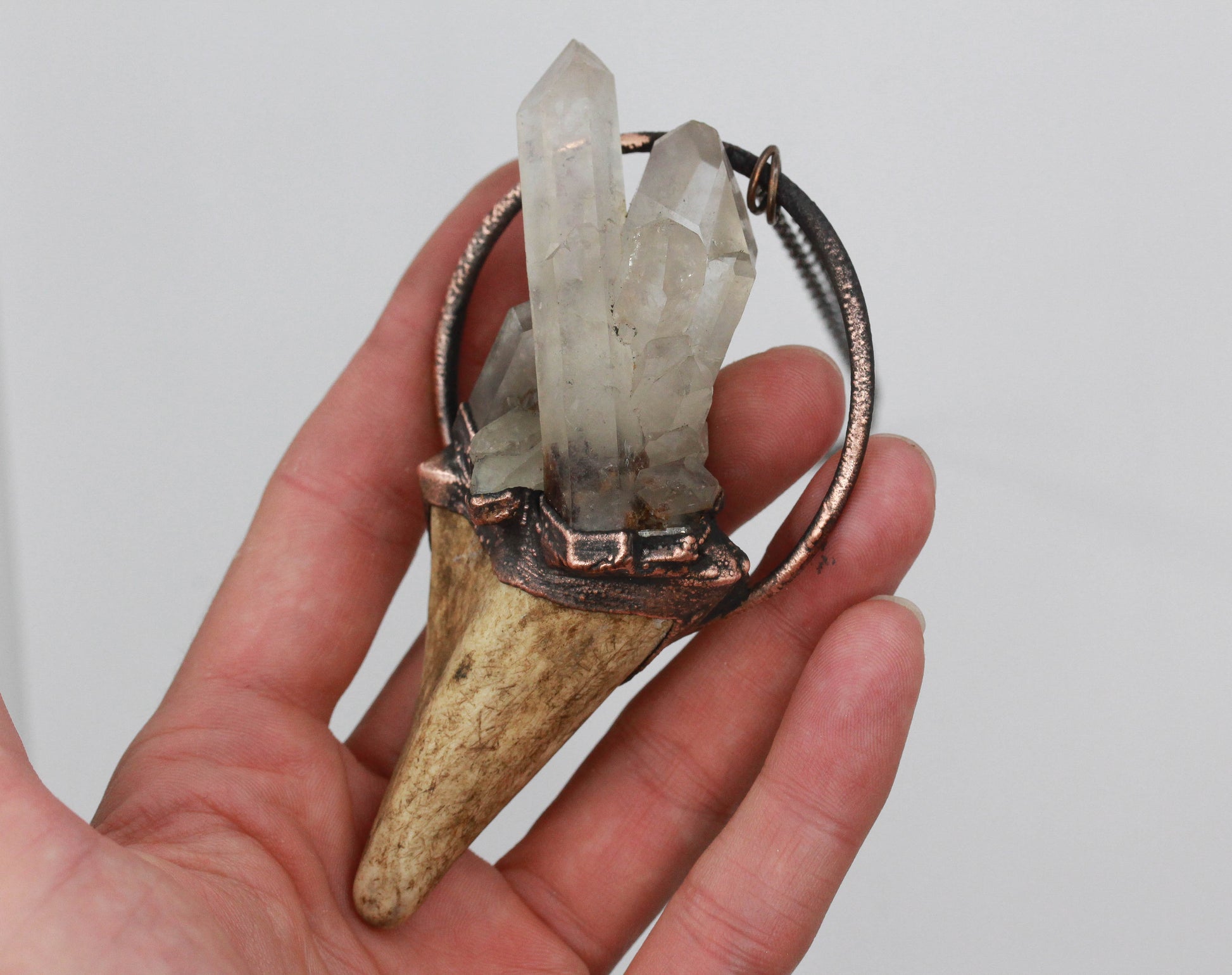 Naturally shed antler tip with a lodolite (garden quartz) cluster on top, all encased in electroformed copper.