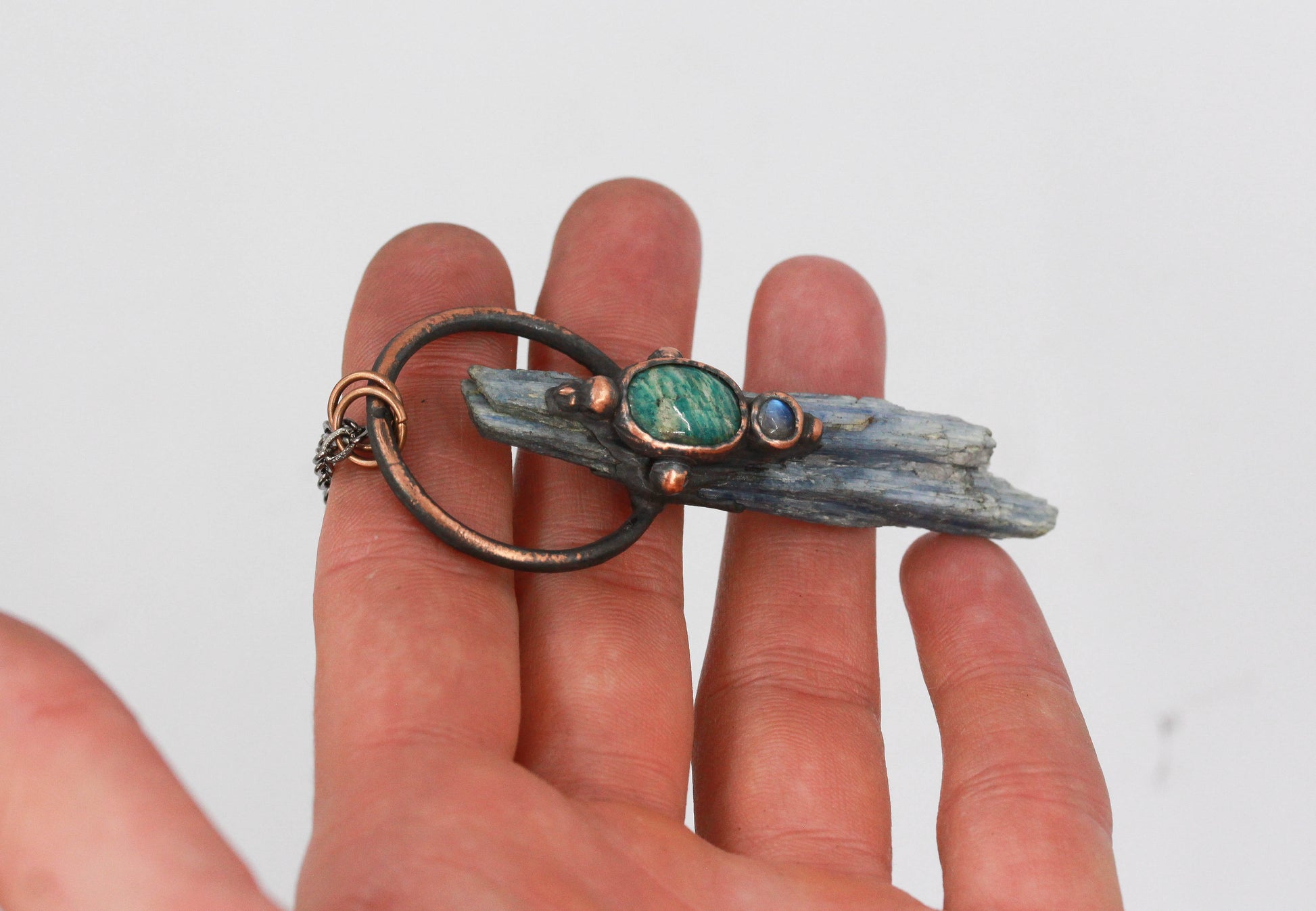 A piece of raw blue kyanite with an amazonite and moonstone at the center, surrounded by an oxidized copper hoop.