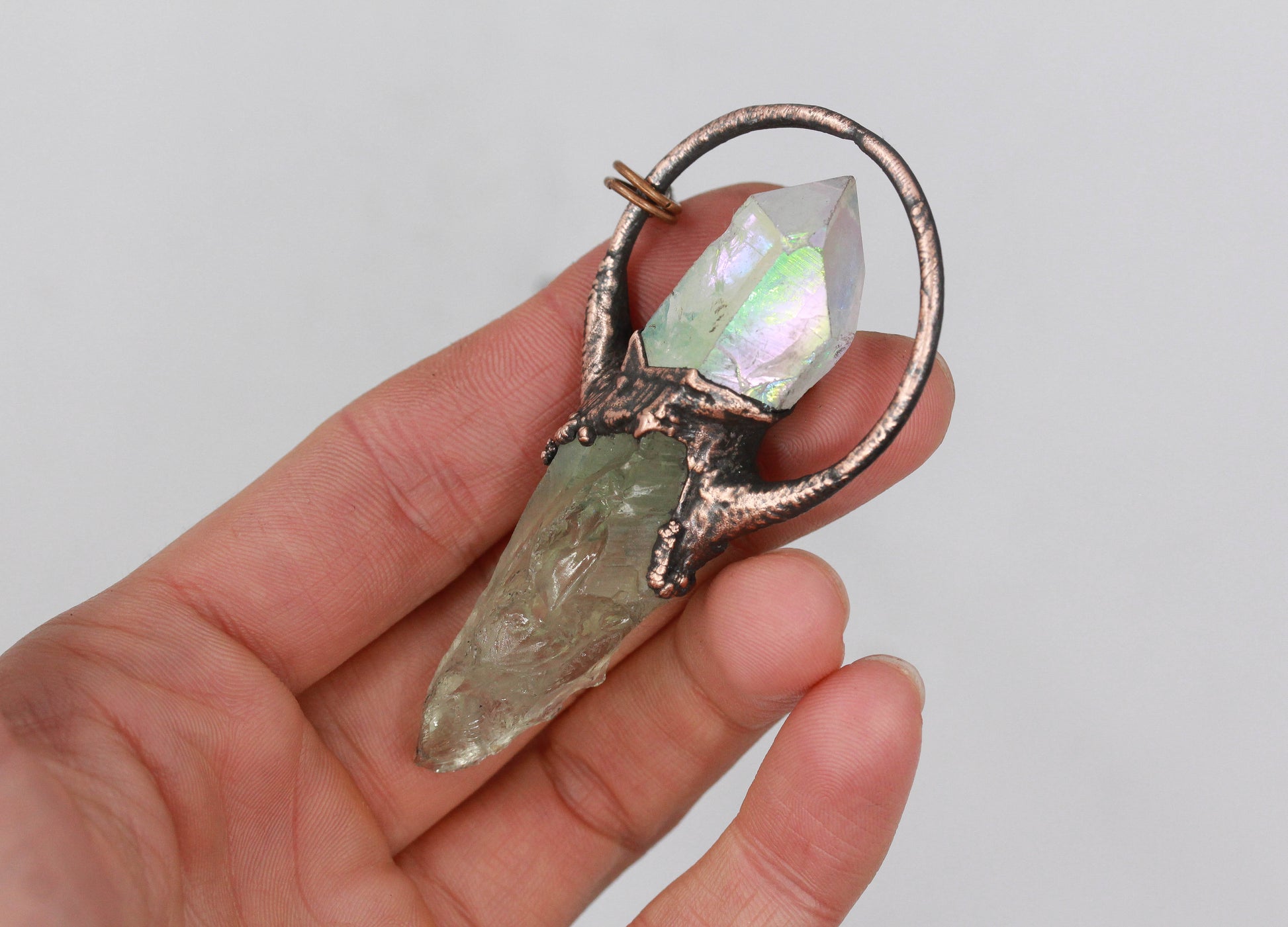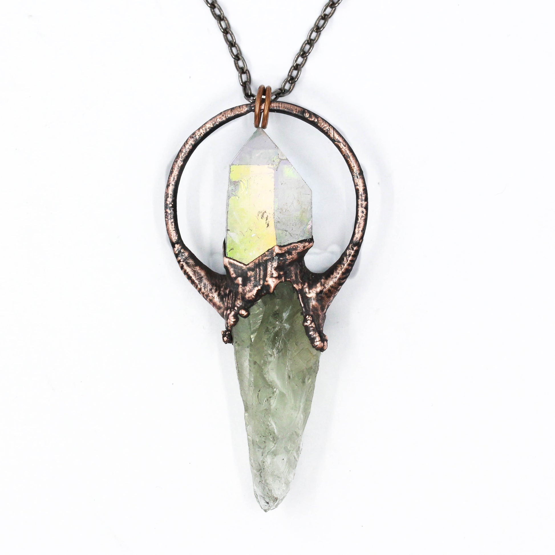 A prasiolite with an angel aura quartz above, set in a electroformed copper.