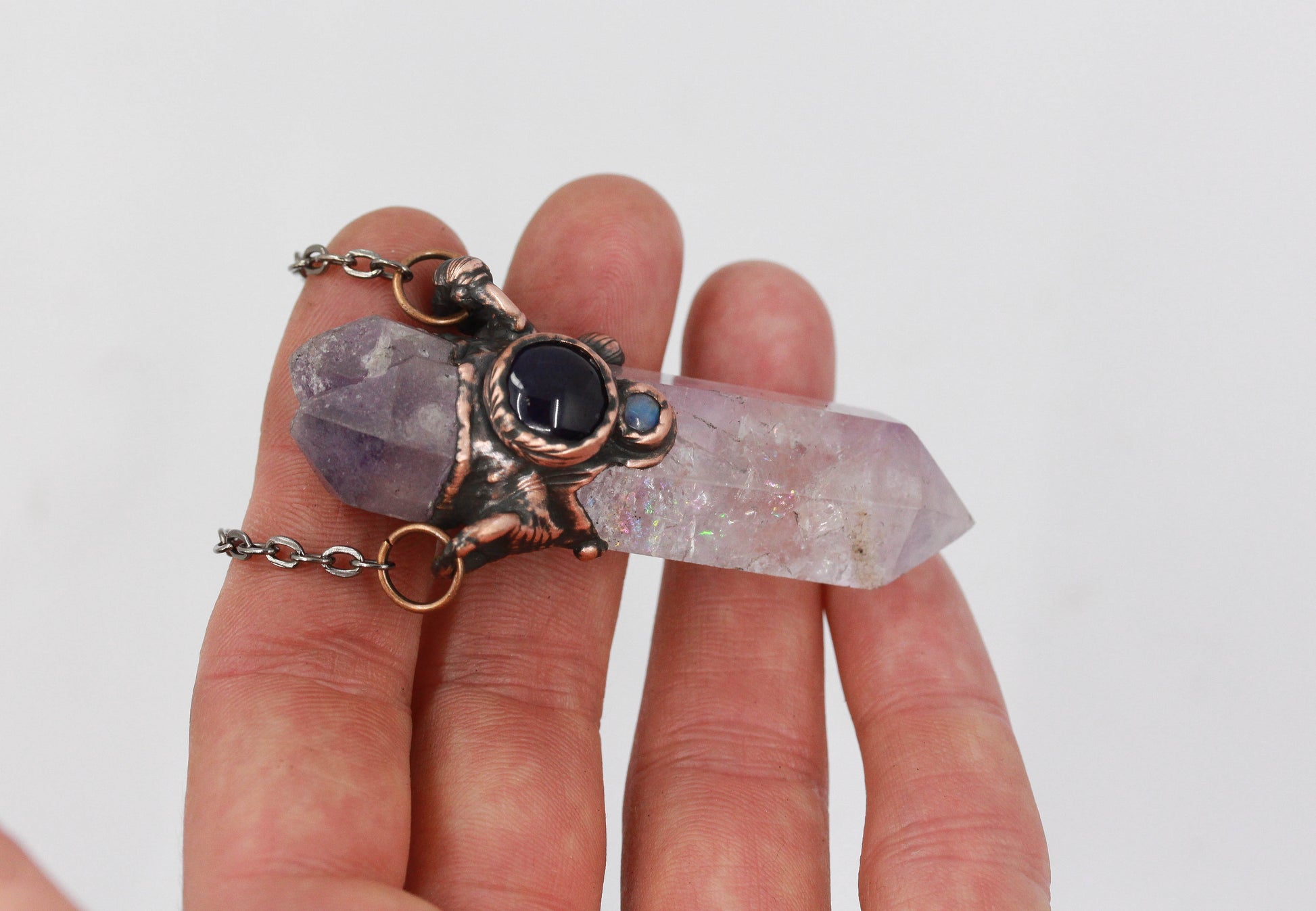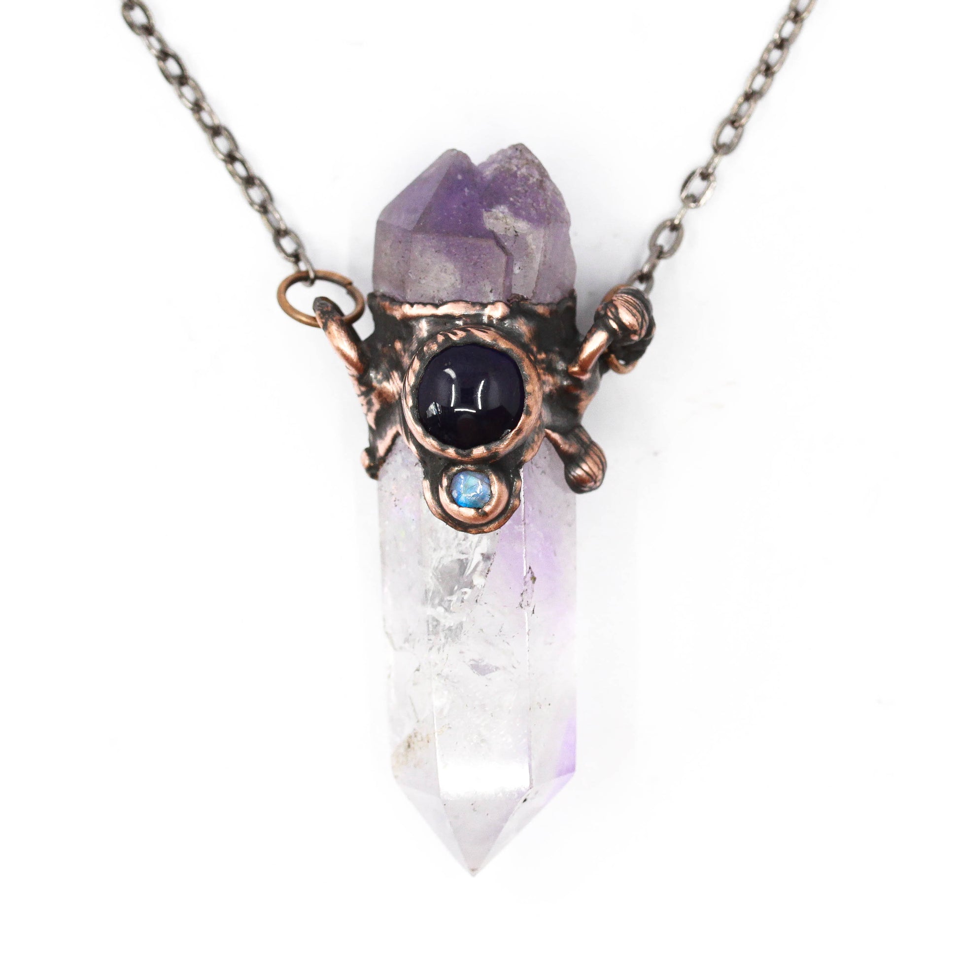 A polished pale amethyst point with an amethyst on top and a moonstone and amethyst at the center. Set in a thick layer of electroformed copper.