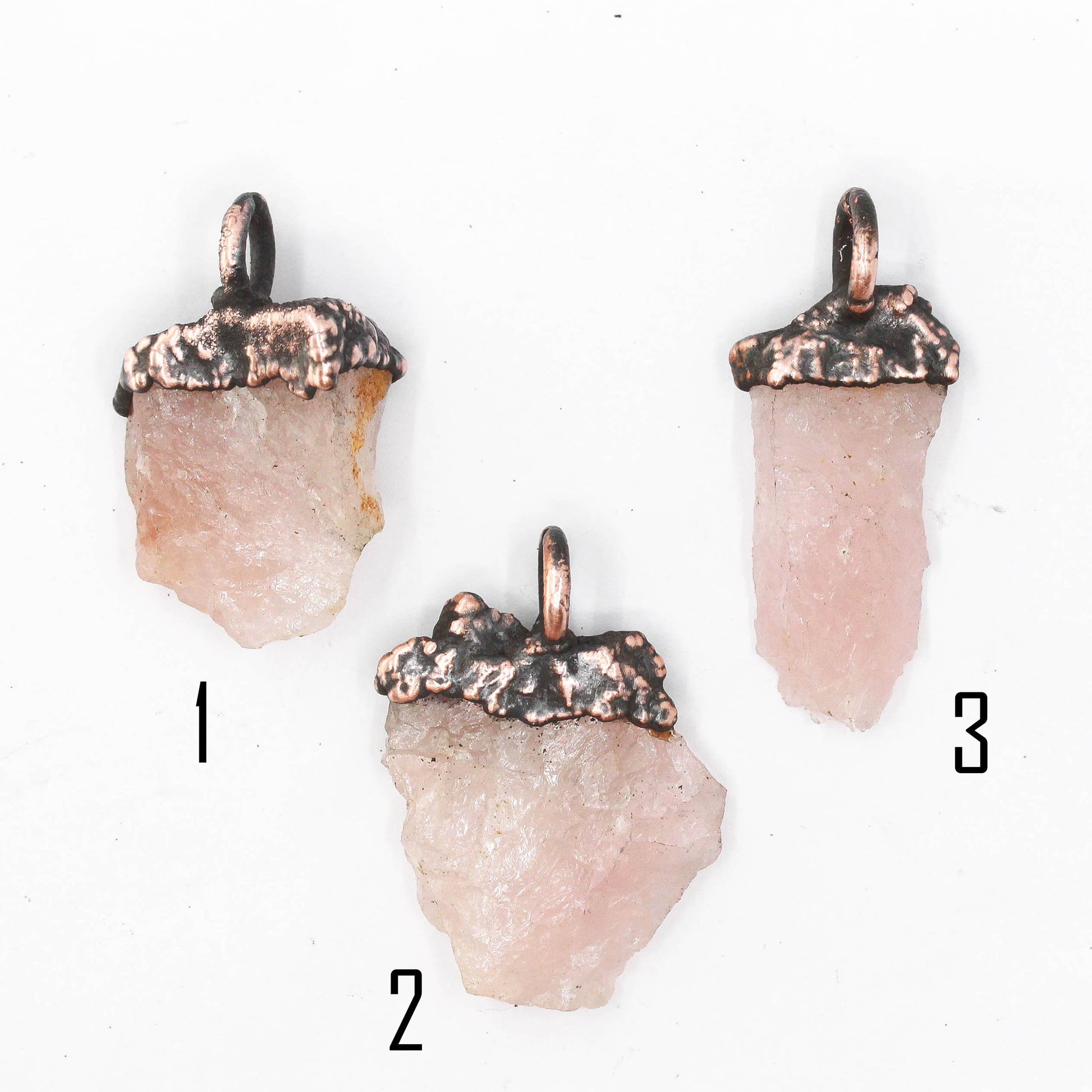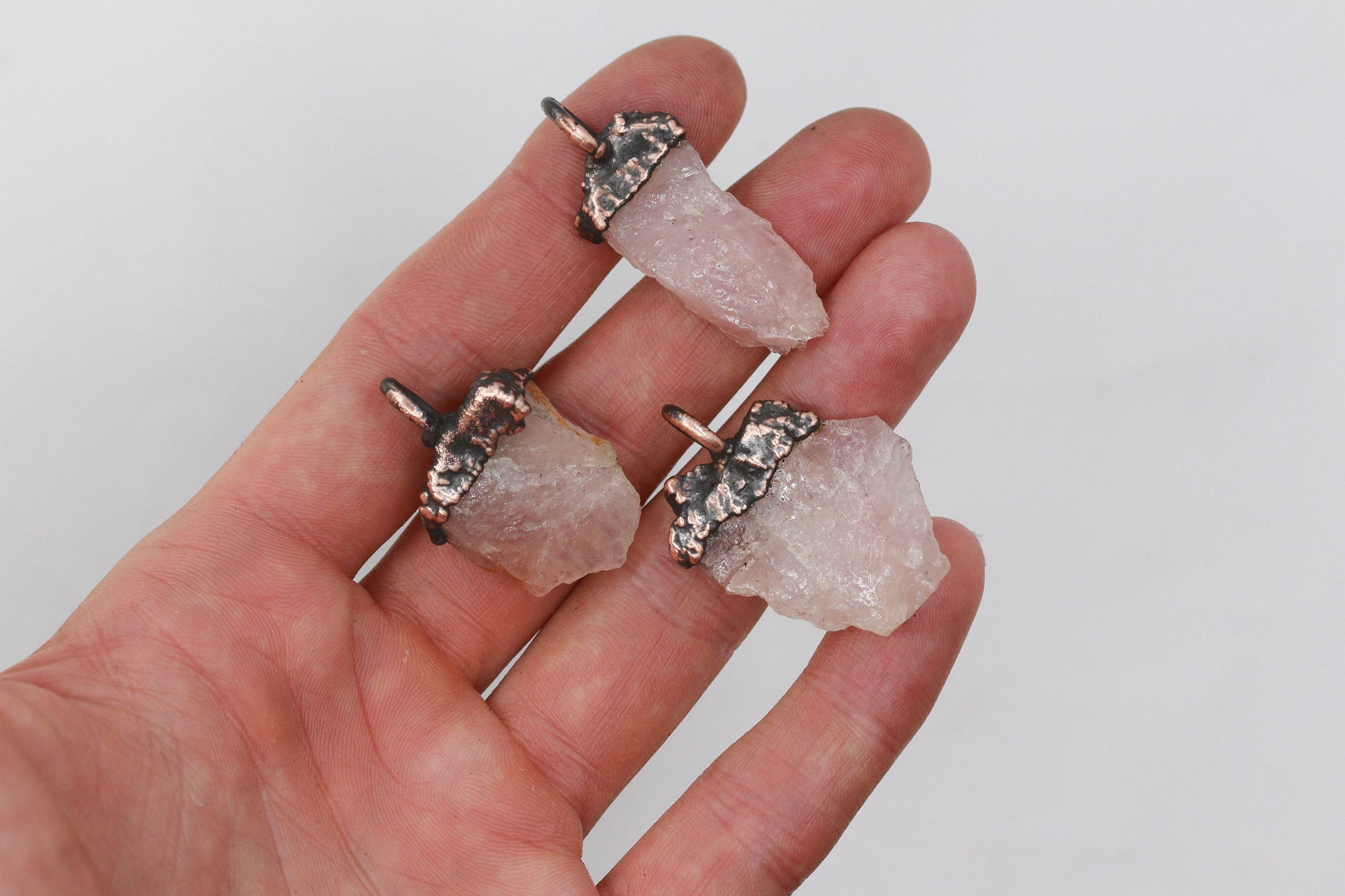 A chunk of raw rose quartz set in a thick layer of electroformed copper.