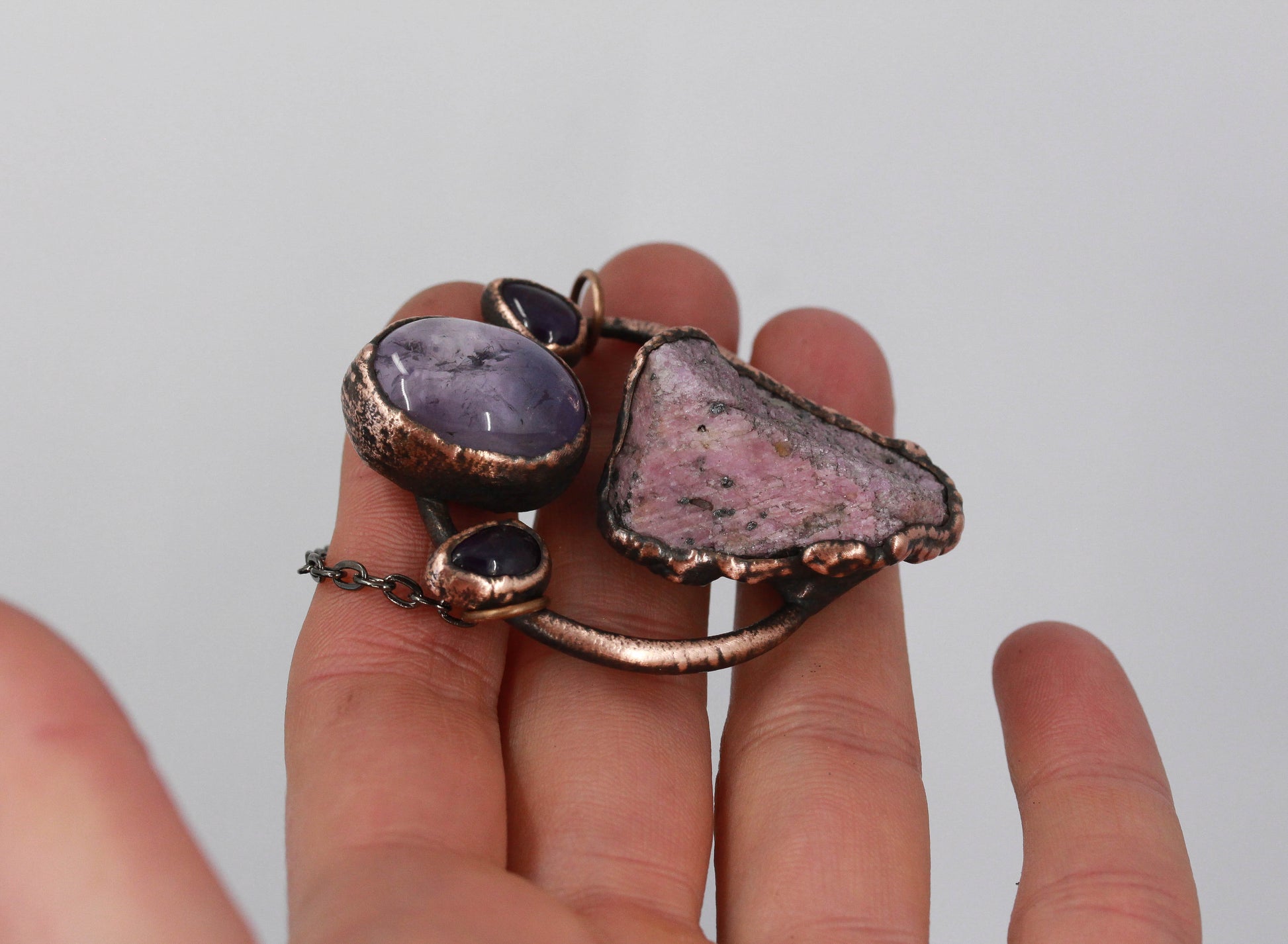 A raw ruby crystal set on an oxidized copper hoop with three amethyst above.