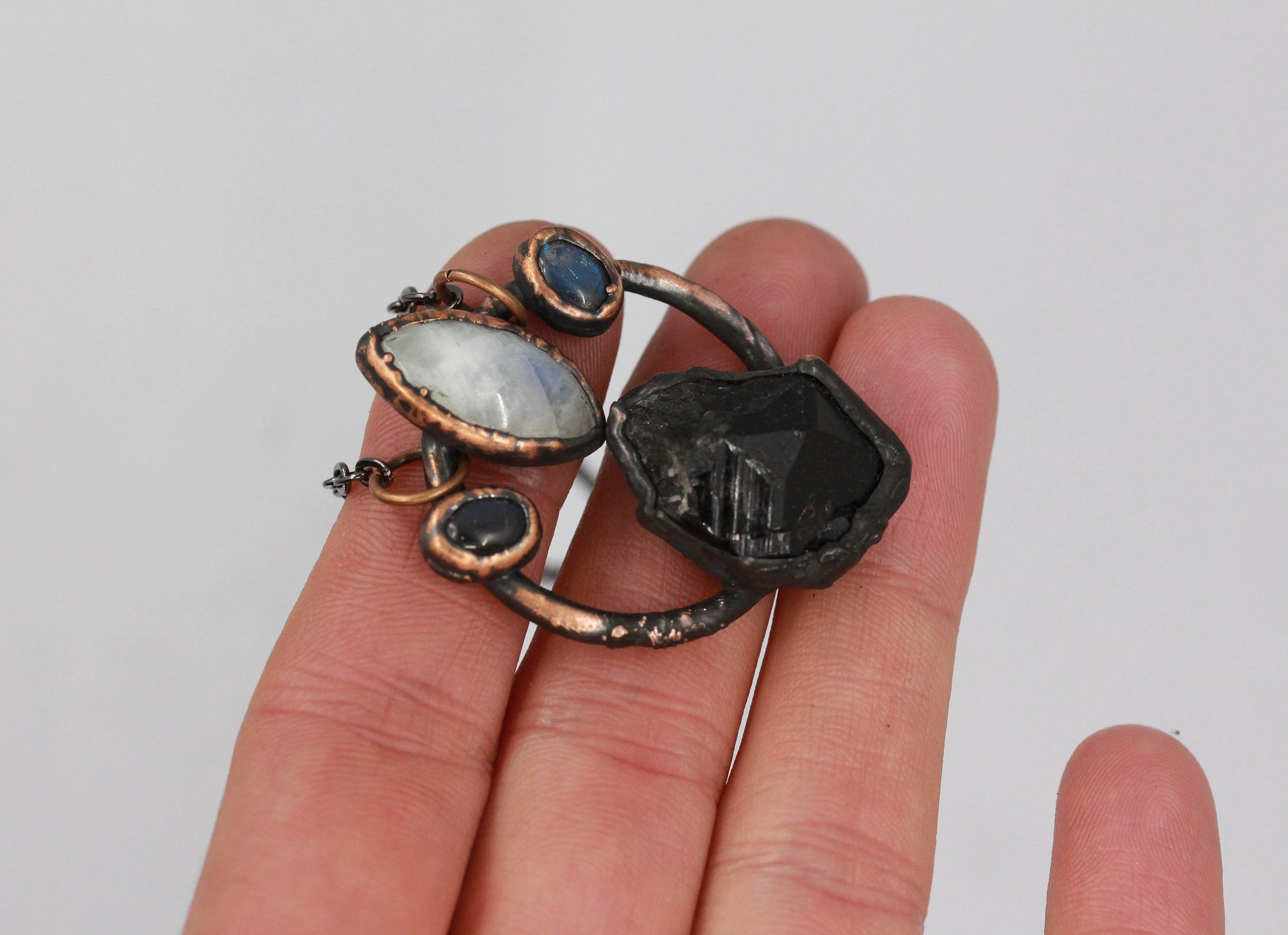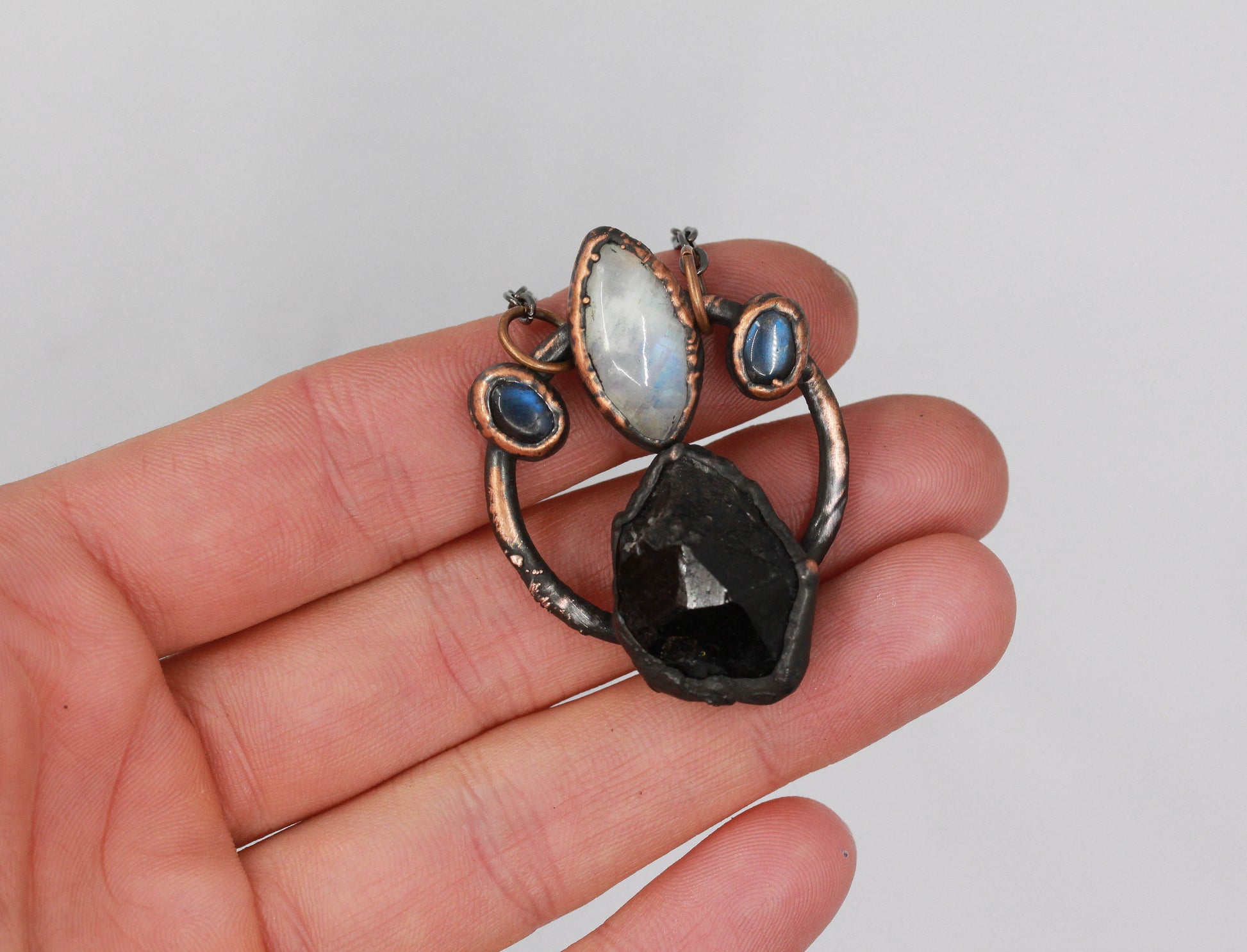 A smoky quartz on an oxidized copper hoop with a moonstone and two labradorite above.
