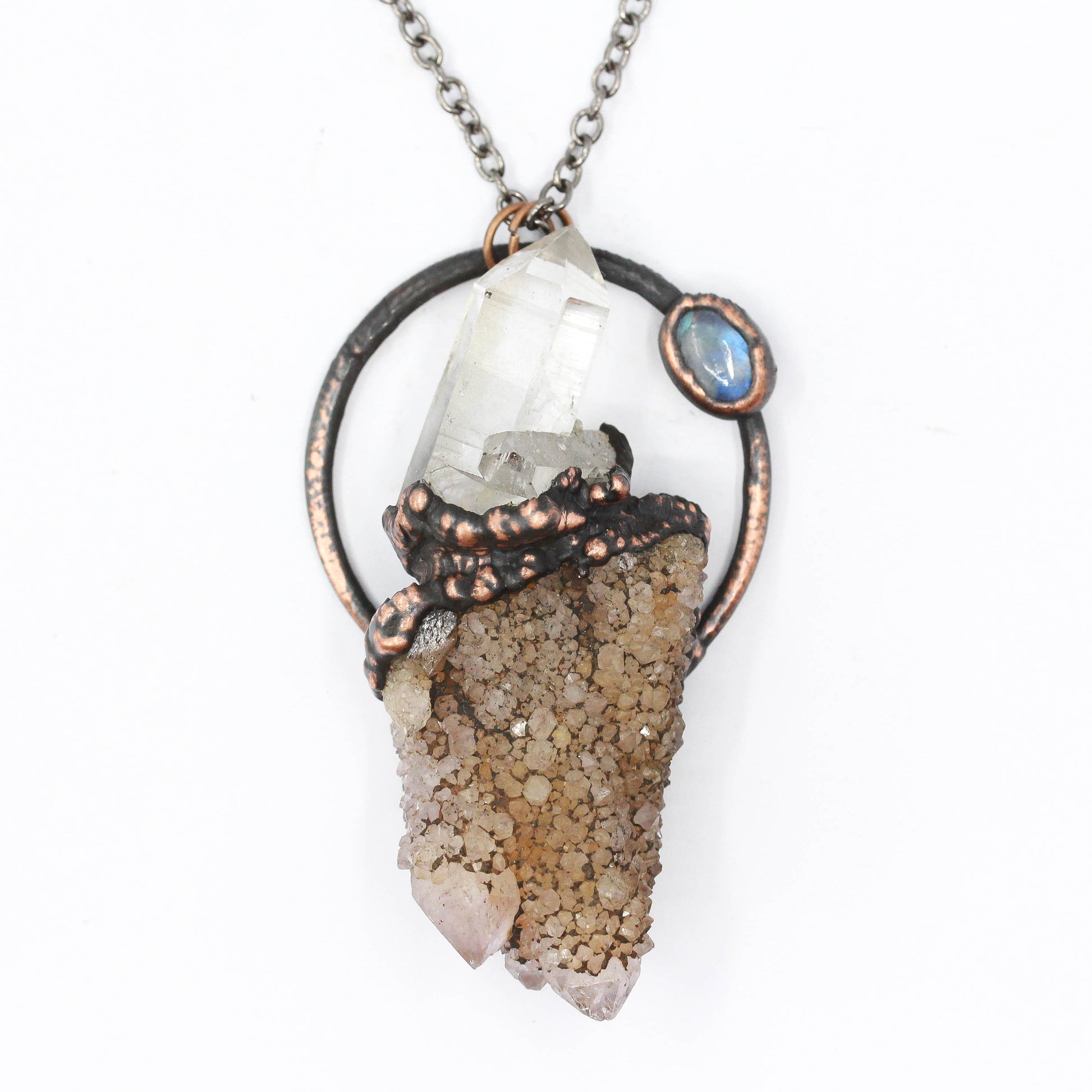A spirit quartz below a clear quartz cluster, on an oxidized copper hoop with a moonstone accents.